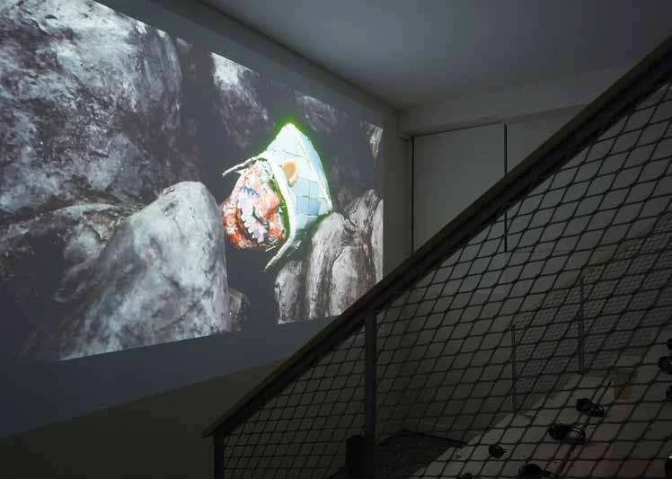 Terrazzo-patterned canvasses cover the walls and the material is picked up as a theme in both the video piece and the installations. the terrazzo is an extension of the astronomy theme because, for Williams, it is symbolic of our size in relation to the galaxy: we are the “tiny specks”, the chips of quartz and glass that the composite material is made from. the key video piece, made in collaboration with two video-makers from cardiff, is a ilm about a dentist from a mosaic mural becoming animate, and then narrated by someone (it wasn’t clear whether by the dentist himself or a bystander). the point of view of the narrator in the video switches between patients and psyche, childhood trauma and memories.